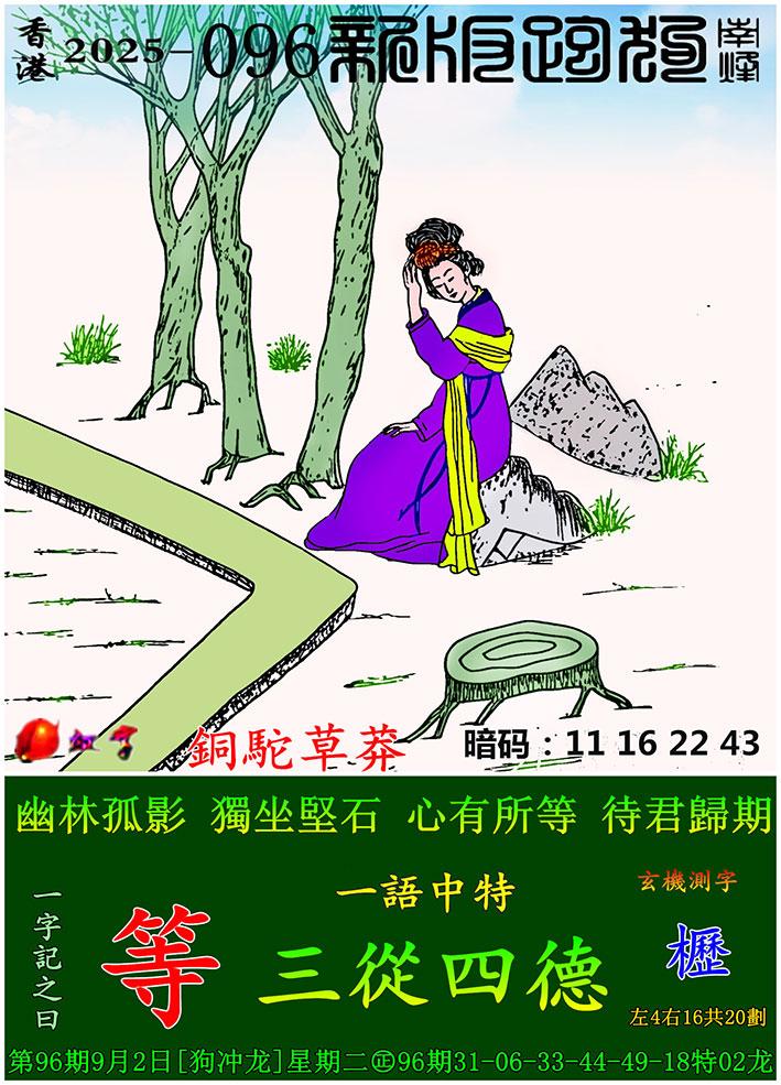 096期新版跑狗一字記之曰:【等】 玄機測字:《櫪》 一語中特:三從四德