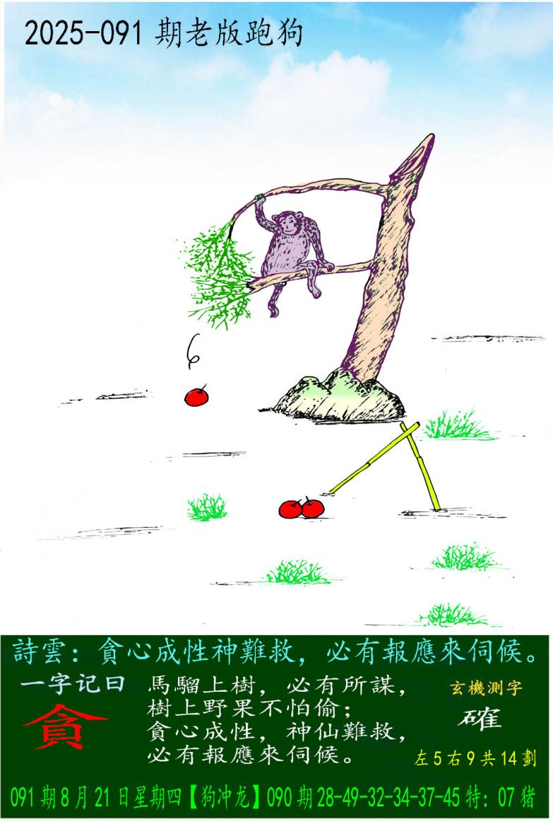 091期老版跑狗一字記之曰:【貪】 詩雲:貪心成性神難救,必有報應來伺候。